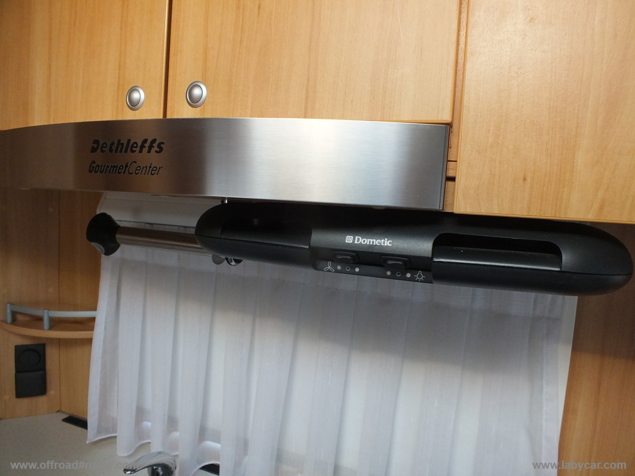 Cucina con on fornello a 3 fuochi, cappa aspirante DOMETIC, frigo Dometic grande con freezer separato.